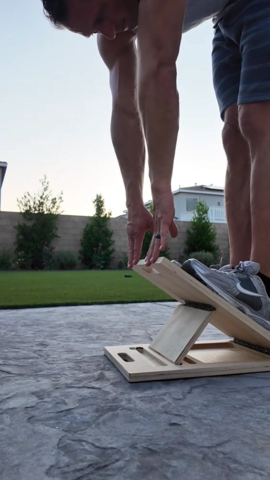 Bent-Knee Soleus Stretch: Stand on board, bend knees slightly to stretch soleus.