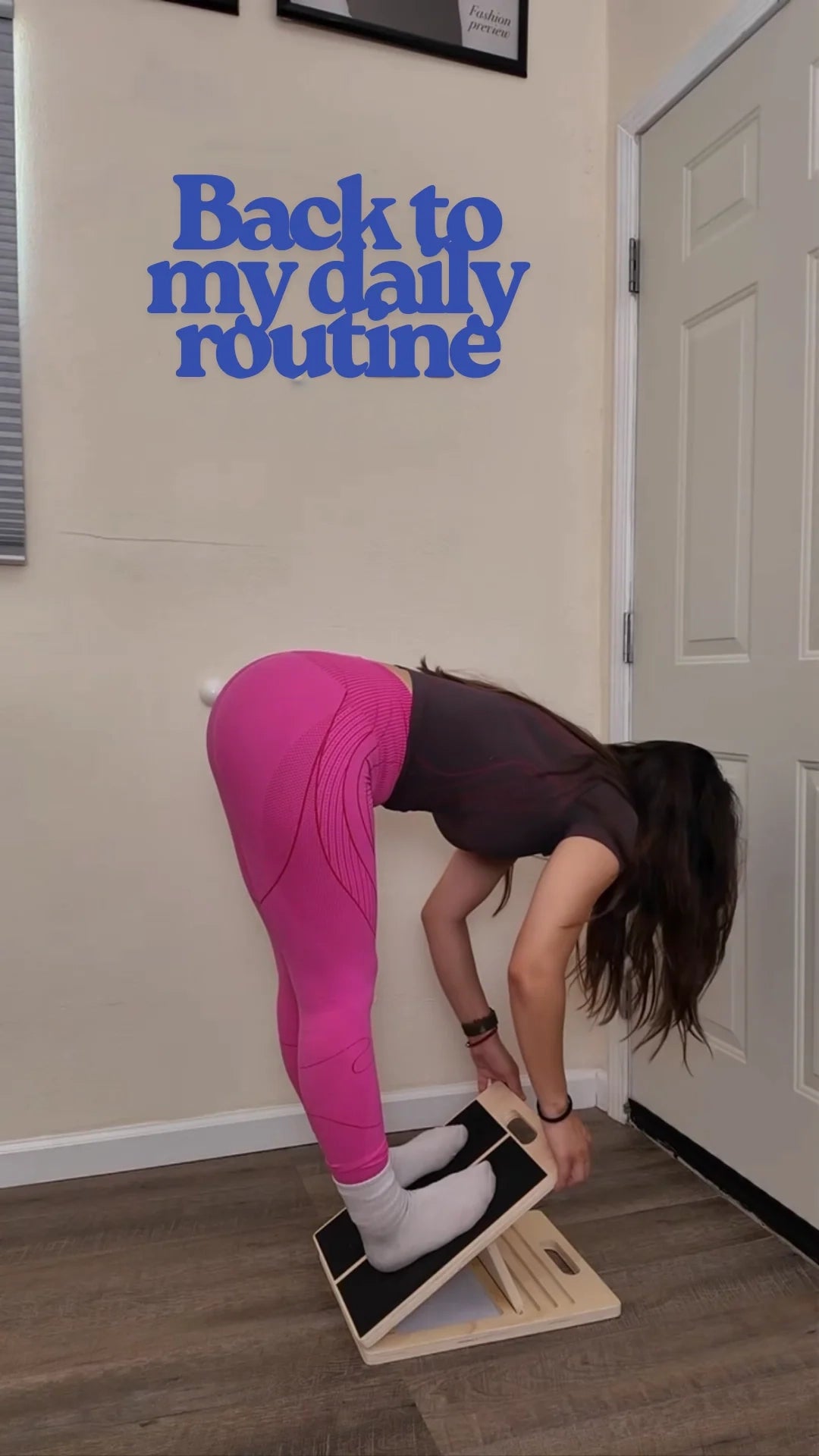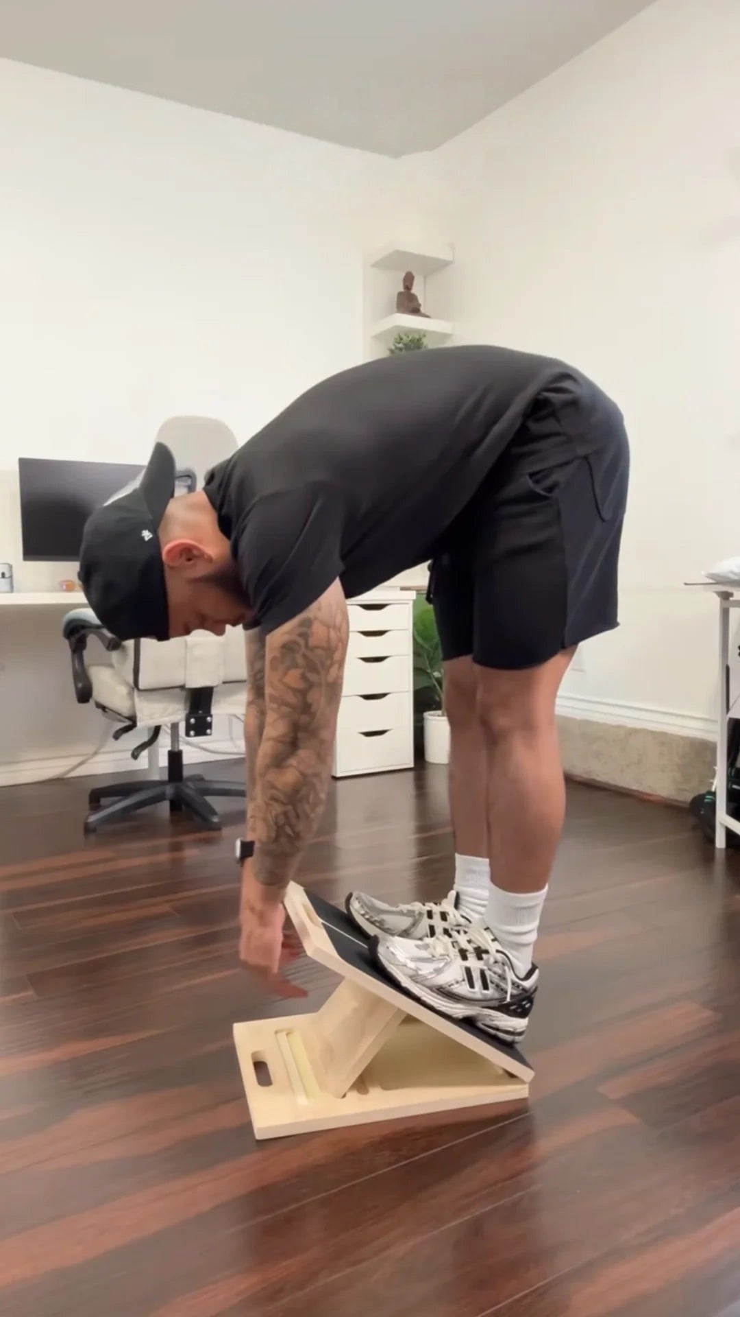 Straight-Leg Hamstring Stretch: Place one heel on the board, leg straight, hinge forward with flat back.